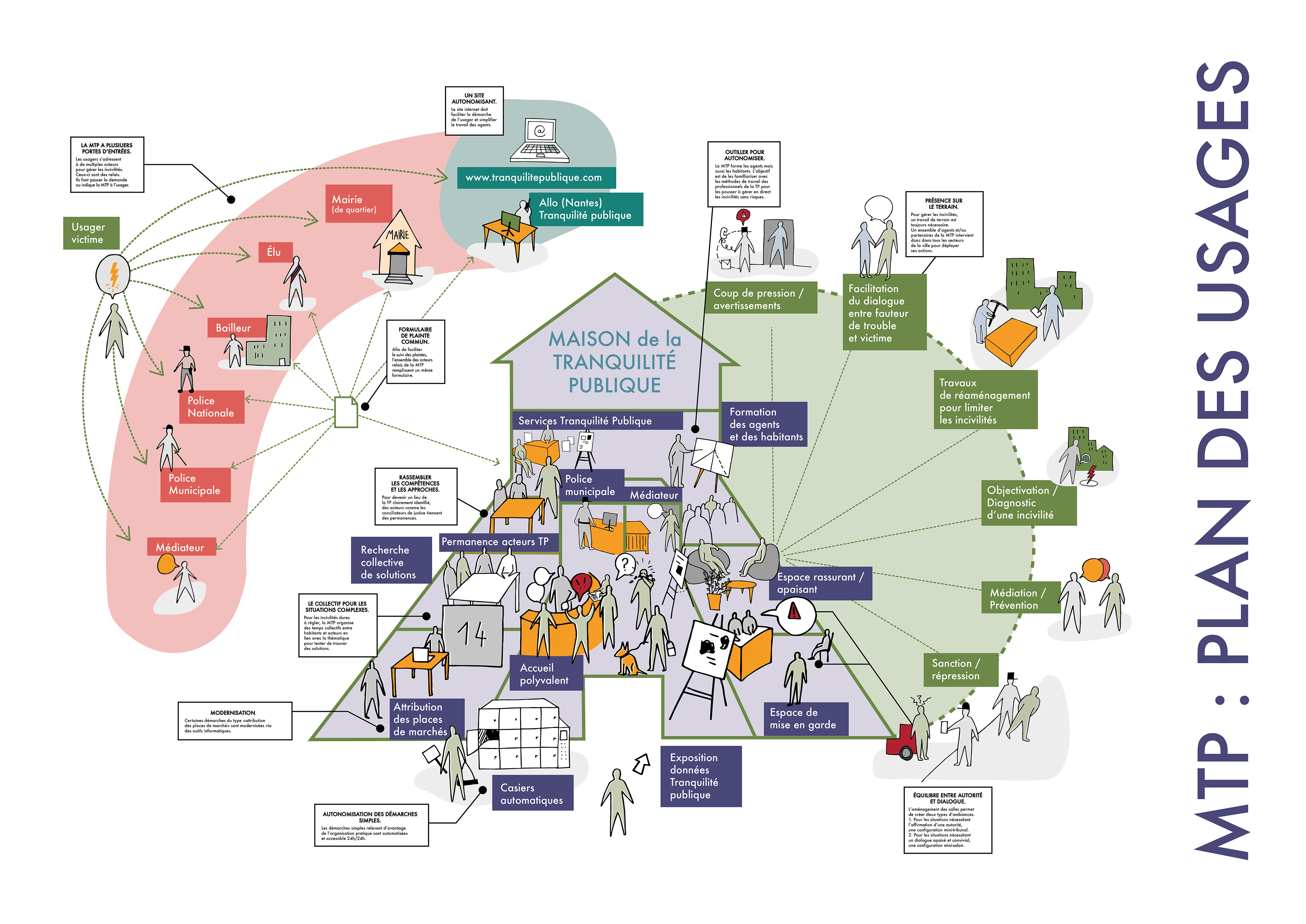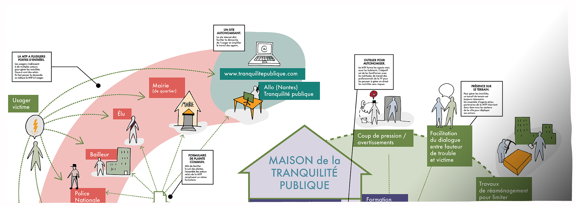 Un des engagements forts de la Maire de Nantes est de construire la Maison de la Tranquillité Publique. L’ambition est de proposer aux Nantais, un lieu offrant, écoute, dialogue et solutions concrètes pour gérer les problèmes d’incivilités et de sécurité et améliorer le vivre-ensemble.Ce dispositif rassemble des services existants aux pratiques éclectiques et propose des services nouveaux, notamment des services en ligne. Afin d’anticiper la façon dont le service vivra et fonctionnera au quotidien et de cibler un ensemble d’idées réalistes en phase avec les besoins des usagers, une immersion dans différents quartiers et un atelier de co-construction ont eu lieu.