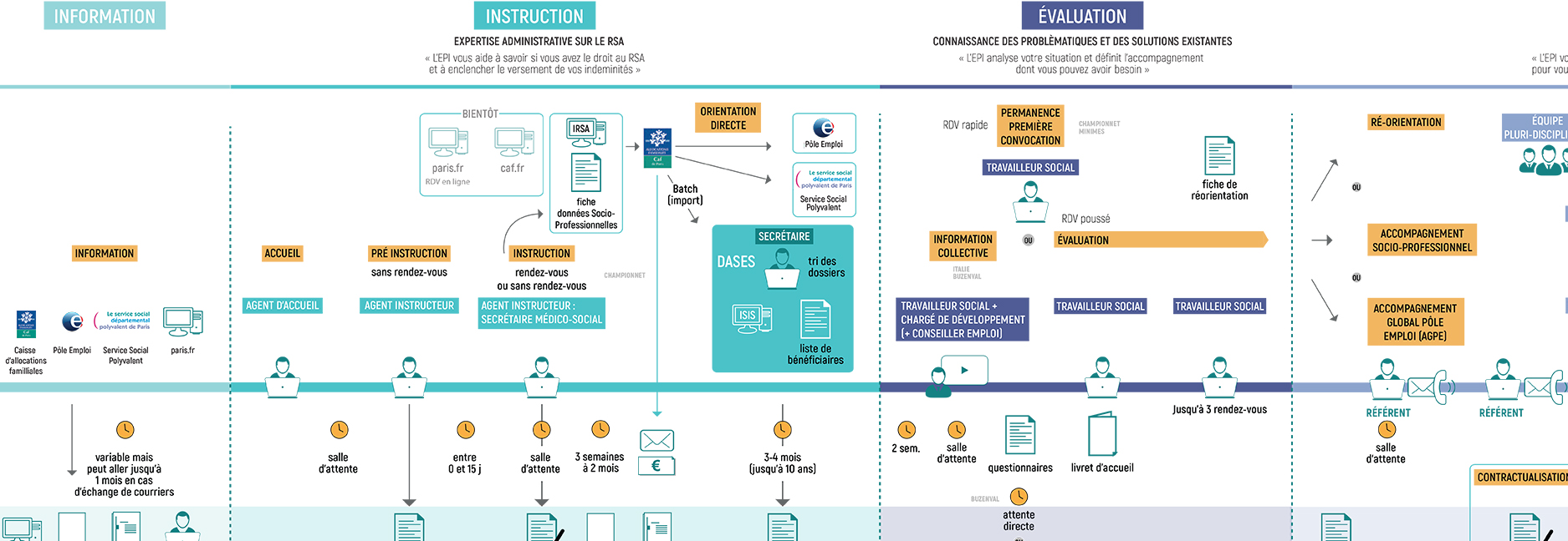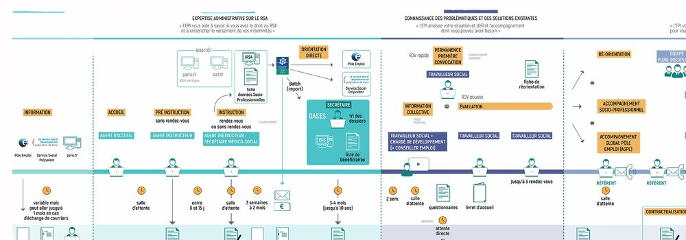Pour la rédaction de son nouveau projet de services, la direction en charge de la gestion du RSA, a souhaité mettre en place une démarche de design des politiques publiques ayant pour objectif de mieux intégrer le point de vue de l’usager et de mettre rapidement en place une phase de test pour vérifier la pertinence des sujets stratégiques retenus.